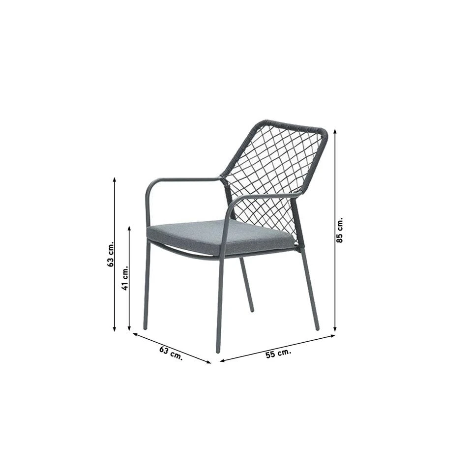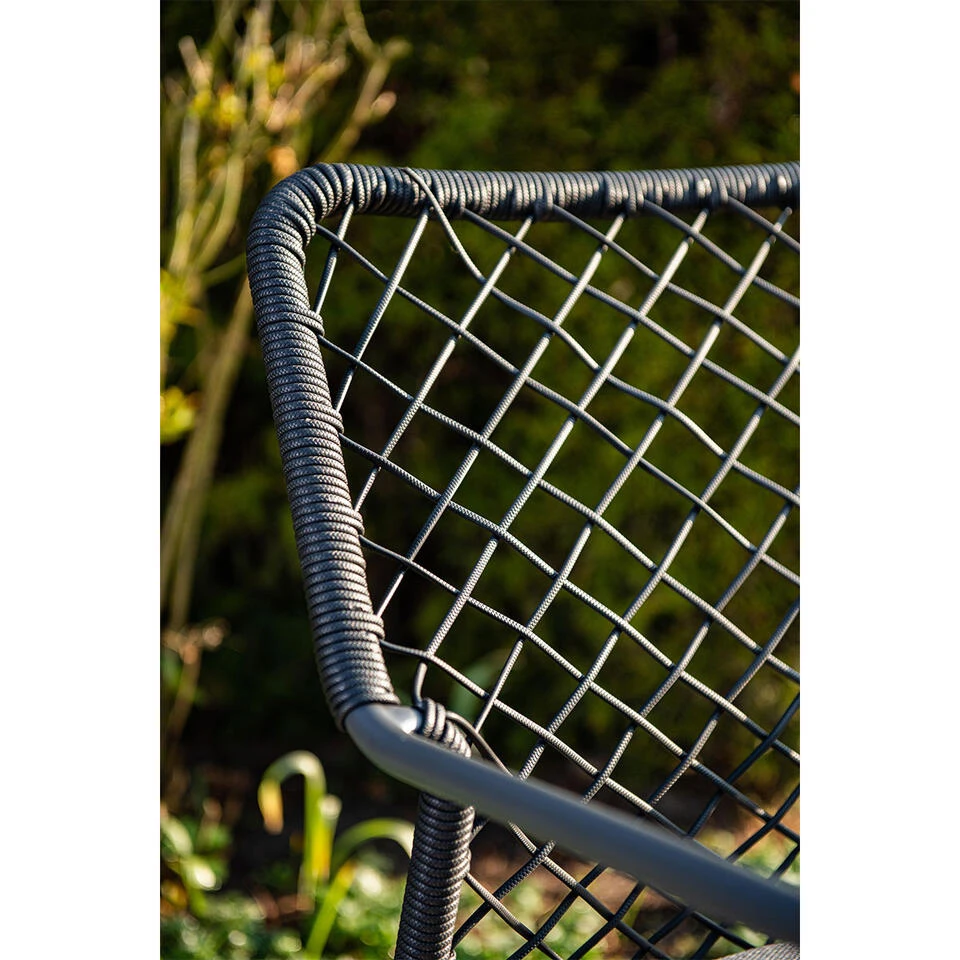 De Ross tuinstoel is vervaardigd uit een onderhoudsvrij aluminium frame met een stevige poedercoating. Om dit stevige aluminium frame zit 5 mm dik hoogwaardige kwaliteit touw. Dit touw heeft een donker grijze kleur en is te vergelijken met touw dat in de scheepsvaart gebruikt wordt. Het touw is voorzien van een rubberen kern binnenin met daarin meerdere polyester draden voor de stevigheid. Om de rubberen kern zit solution dyed polyester rope. Dit betekent dat het touw door en door gekleurd is en verkleurt veel minder snel. Aluminium kan vies zijn geworden door opspattend regenwater of gemorst drinken bijvoorbeeld.